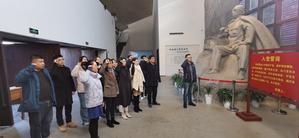 在田汉艺术中心,支部书记李孟良带领全体党员重温入党誓词。大家参观田汉艺术中心,认真聆听讲解,仔细观看图片文字,观摩田汉以文艺为武器,为国家独立和民族解放创作的不朽艺术作品,回顾田汉“宁流血,不曲笔”追求光明和真理的奋斗人生。