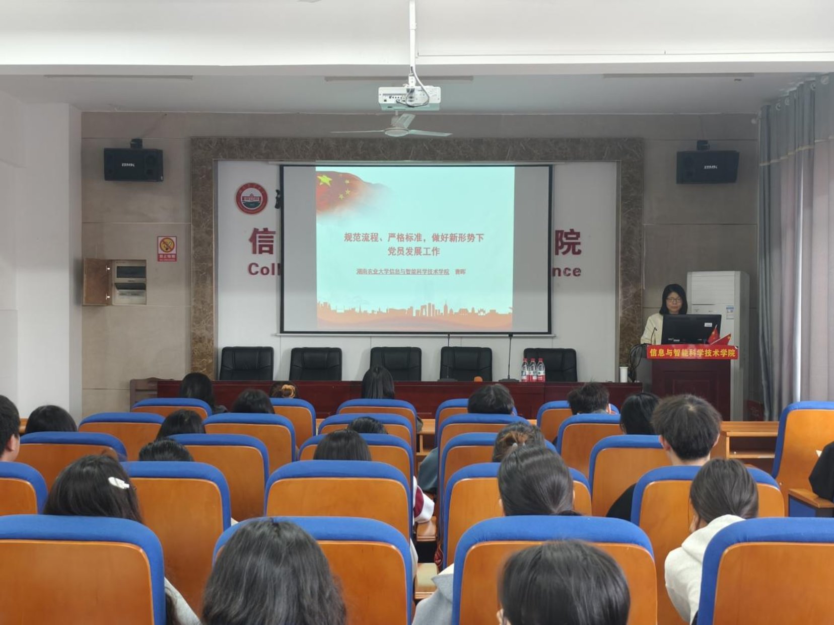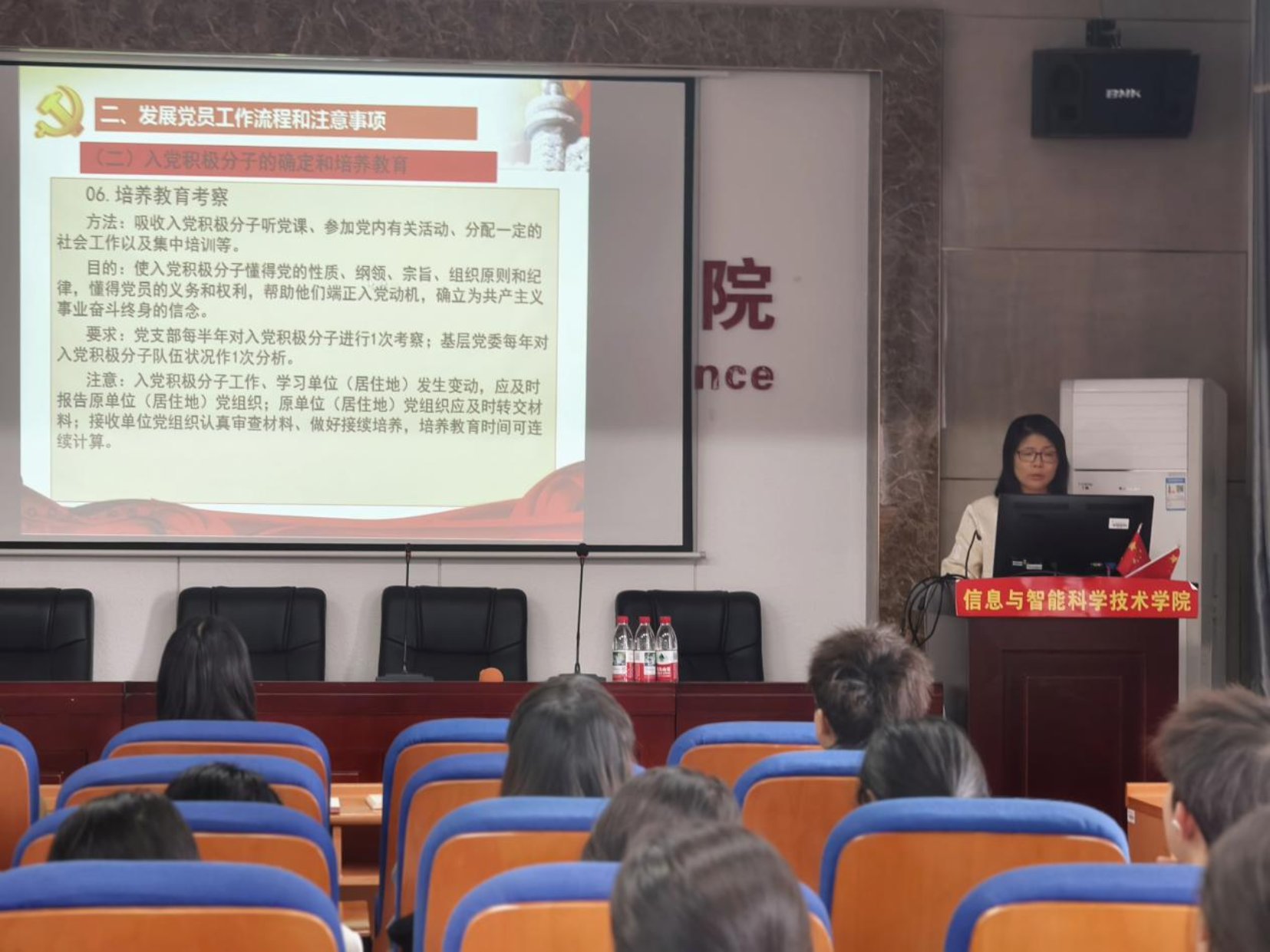 曹晖老师以《规范流程、严格标准,做好新形势下党员发展工作》为主题,从发展党员工作的政策依据和基本要求、发展党员工作基本流程及注意事项、发展党员工作存在的问题及材料规范、发展党员工作主要材料及(撰写)填写说明等四个方面开展培训。曹晖老师指出党员发展工作要以“控制总量”为重点、“优化结构”为关键、“提高质量”为核心、“发挥作用”为目的,强调支部委员需以严肃认真的态度落实各项要求,筑牢基层党建根基。