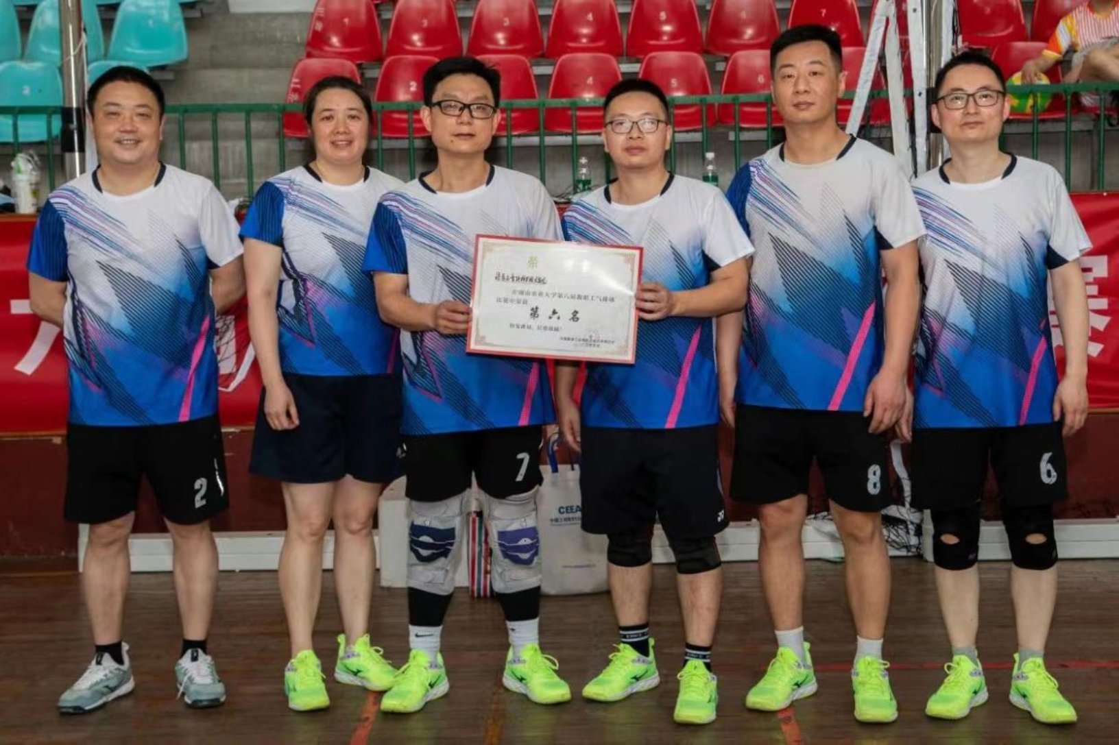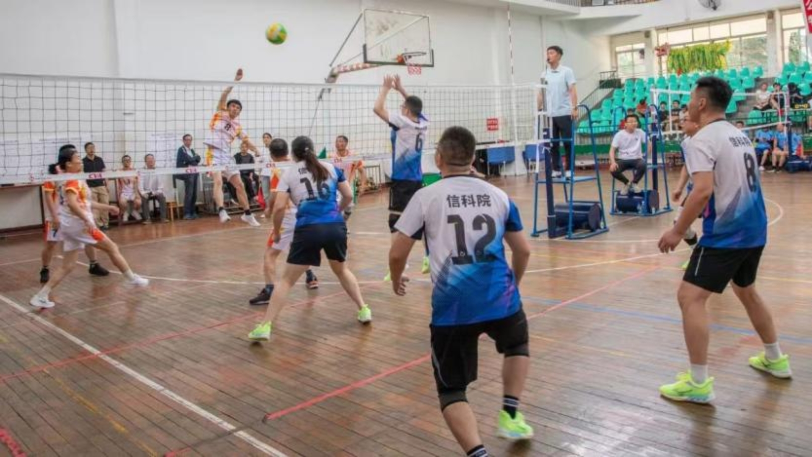 本网讯(信科学院 何轶)5月10日,湖南农业大学第六届教职工气排球赛在体育馆上演终极对决,经过数局激烈鏖战,信科学院气排球队凭借坚韧不拔的毅力和默契无间的团队协作,最终斩获第六名的优异成绩,为学院荣誉簿再添精彩一笔。