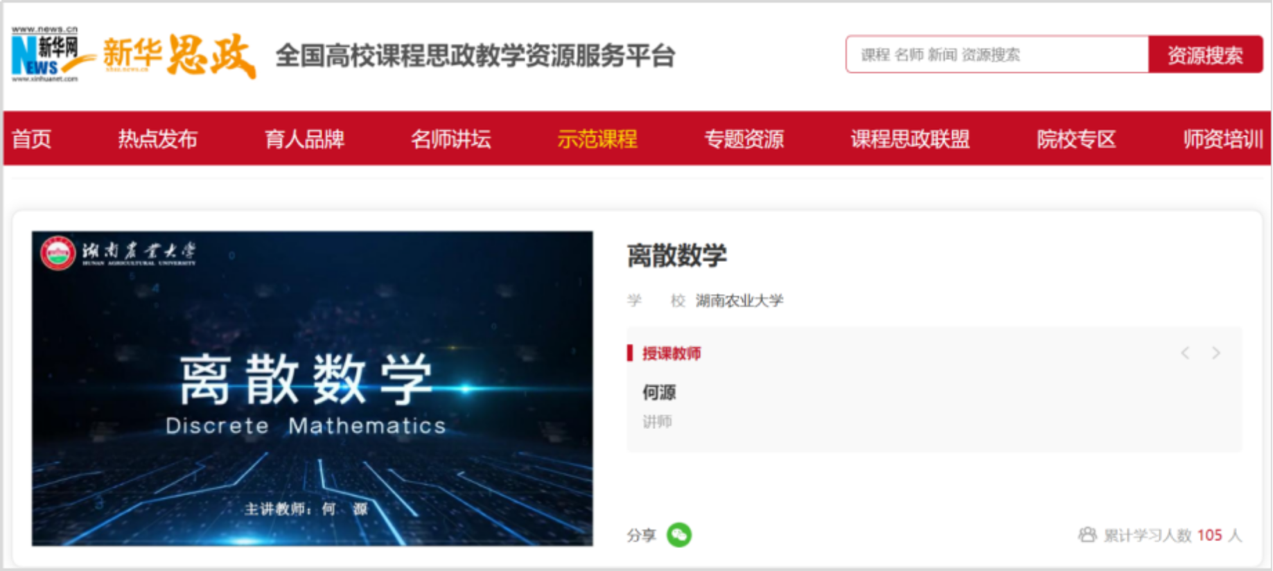 何源老师主讲的的《离散数学》课程已正式入驻新华网“新华思政——全国高校课程思政教学资源服务”平台,面向全社会开放共享。该课程以北斗卫星导航系统的逻辑架构为切入点,将离散数学中的逻辑推理、算法设计与国家重大科技工程紧密结合。通过生动的案例教学,激发学生的科学精神、家国情怀和创新意识,充分展现了“科技报国”的思政主题。