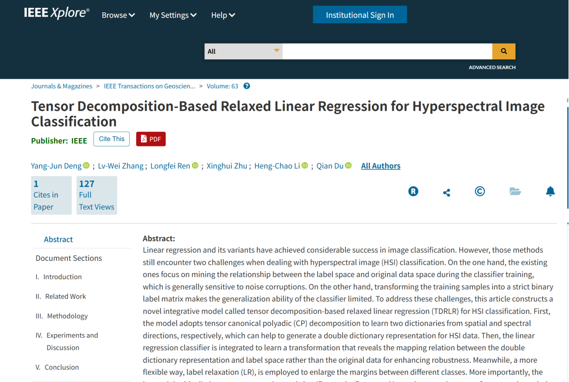 本网讯(信科学院 王俊)近日,我院邓阳君老师指导的硕士研究生张律威在人工智能与遥感交叉领域权威期刊IEEE Transactions on Geoscience and Remote Sensing(IEEE TGRS)上发表了题为《Tensor Decomposition-Based Relaxed Linear Regression for Hyperspectral Image Classification》的研究论文。IEEE TGRS是中科院一区Top期刊,2025年的影响因子为8.6,在遥感技术和地球科学领域享有很高的声誉。这也是邓阳君老师课题组指导的硕士研究生第二次在该刊发表论文。